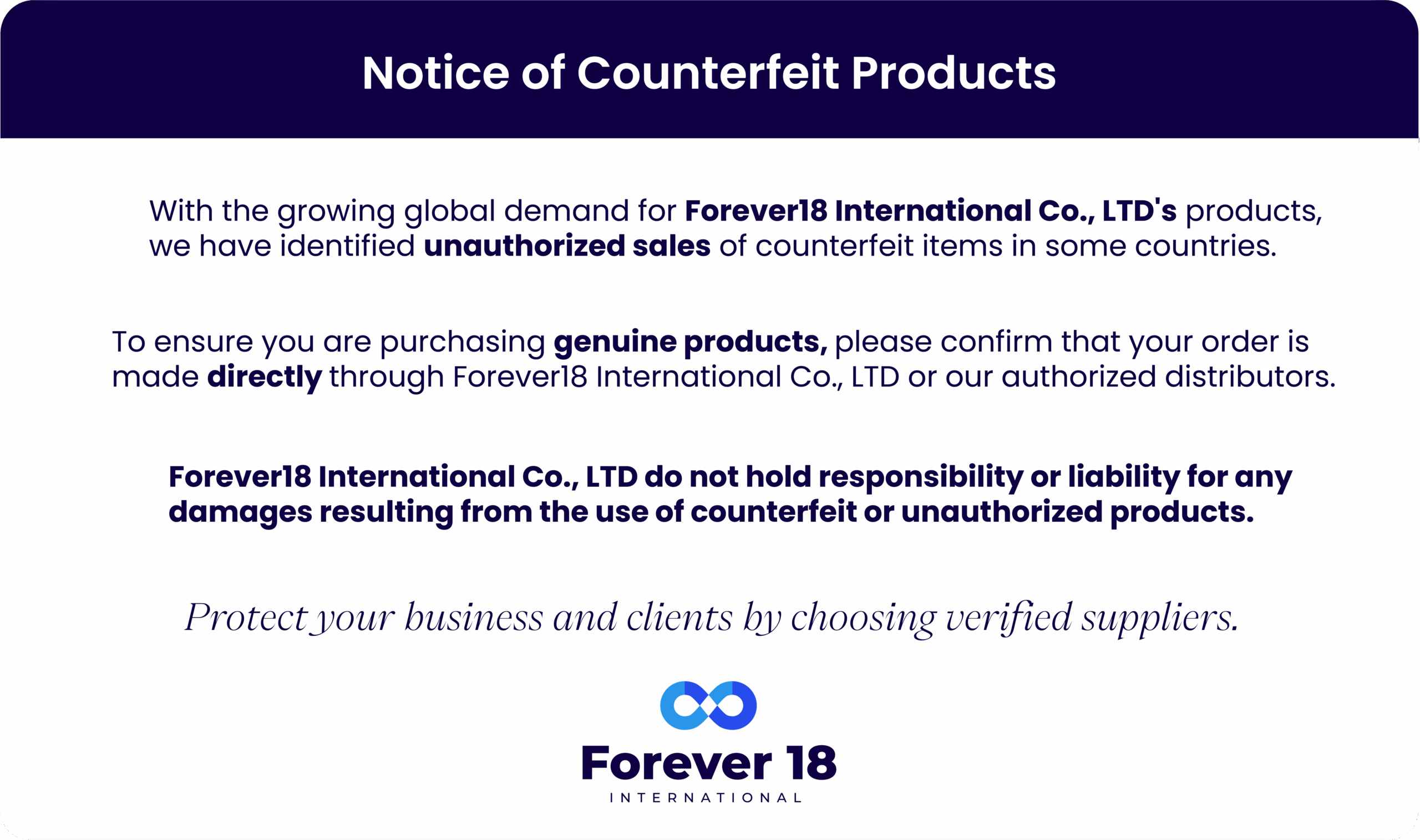Forever18 INTERNATIONAL Co. Ltd’s brands and products are equipped with all necessary certifications and licenses, ensuring compliance with global registration standards and facilitating a seamless official import process. Our dedicated Regulatory Team collaborates closely with partners to meticulously review registration requirements and promptly provide the necessary documentation to support timely product approvals.